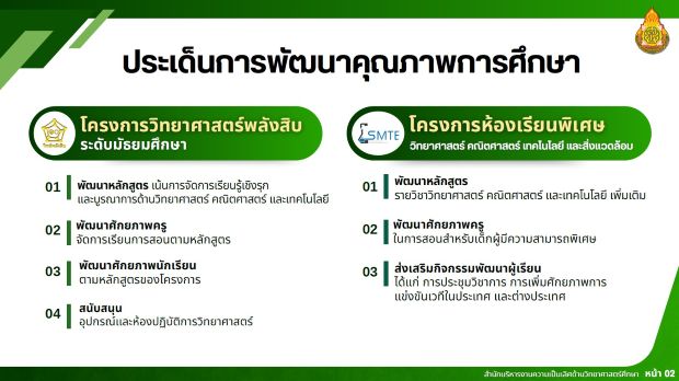 ประเด็นการพัฒนาคุณภาพการศึกษา ในโครงการวิทยาศาสตร์พลังสิบ (ระดับมัธยมศึกษา) และโครงการห้องเรียนพิเศษวิทยาศาสตร์ คณิตศาสตร์ เทคโนโลยีและสิ่งแวดล้อม เป็นดังนี้